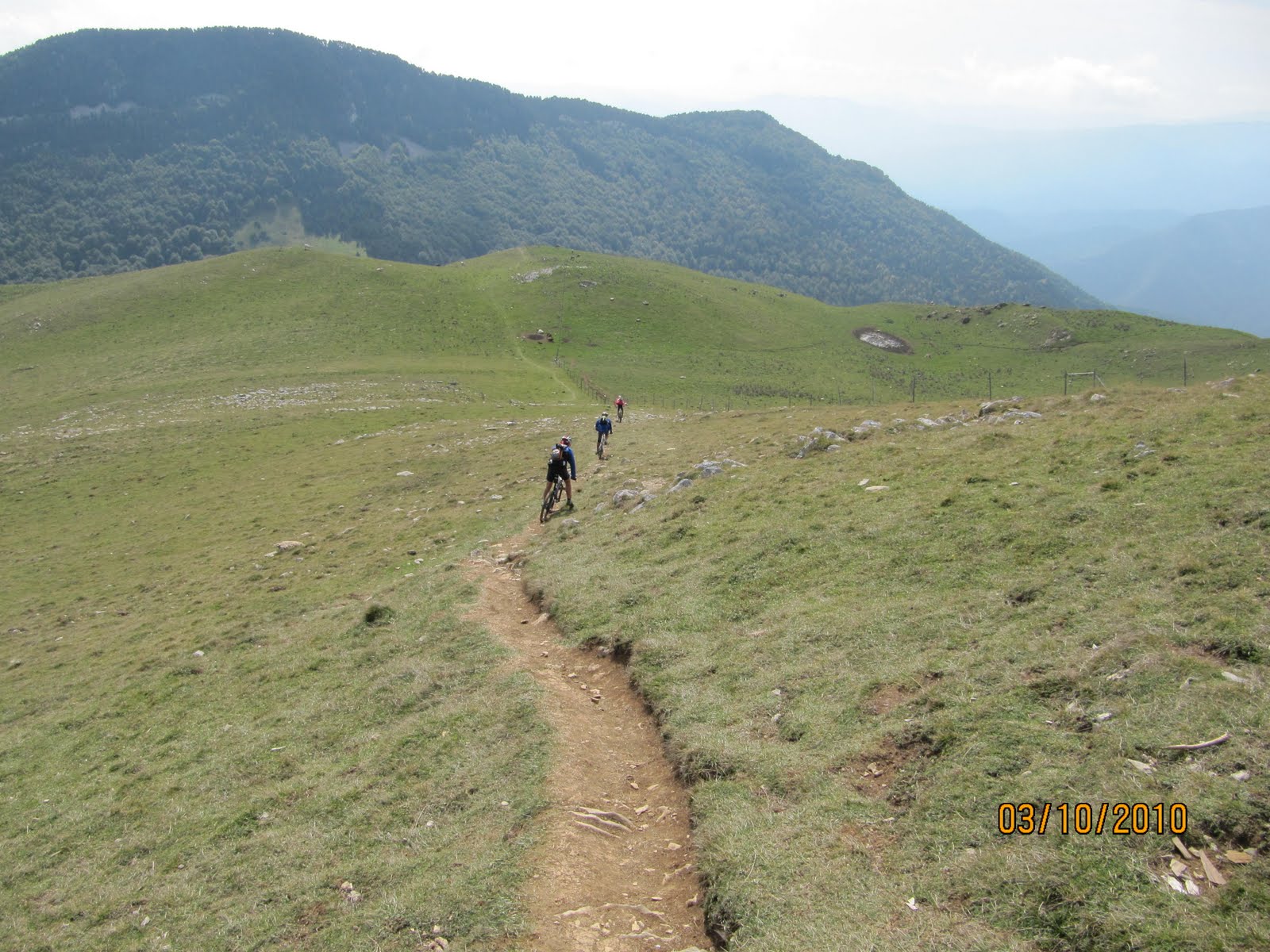 Una vez arriba, y despues de comer el bocata, gran bajada espectacular hasta Coll de Jou,(ver videos)donde una pista rapidisima nos lleva hasta un cruze donde lo cogemos pensando que iba a ser un senderito y escondia un camino un poco guarro donde a Miquel le costo el cambio trasero por culpa de una rama endemoniada, se lo doblo, y tubimos que remolcar.